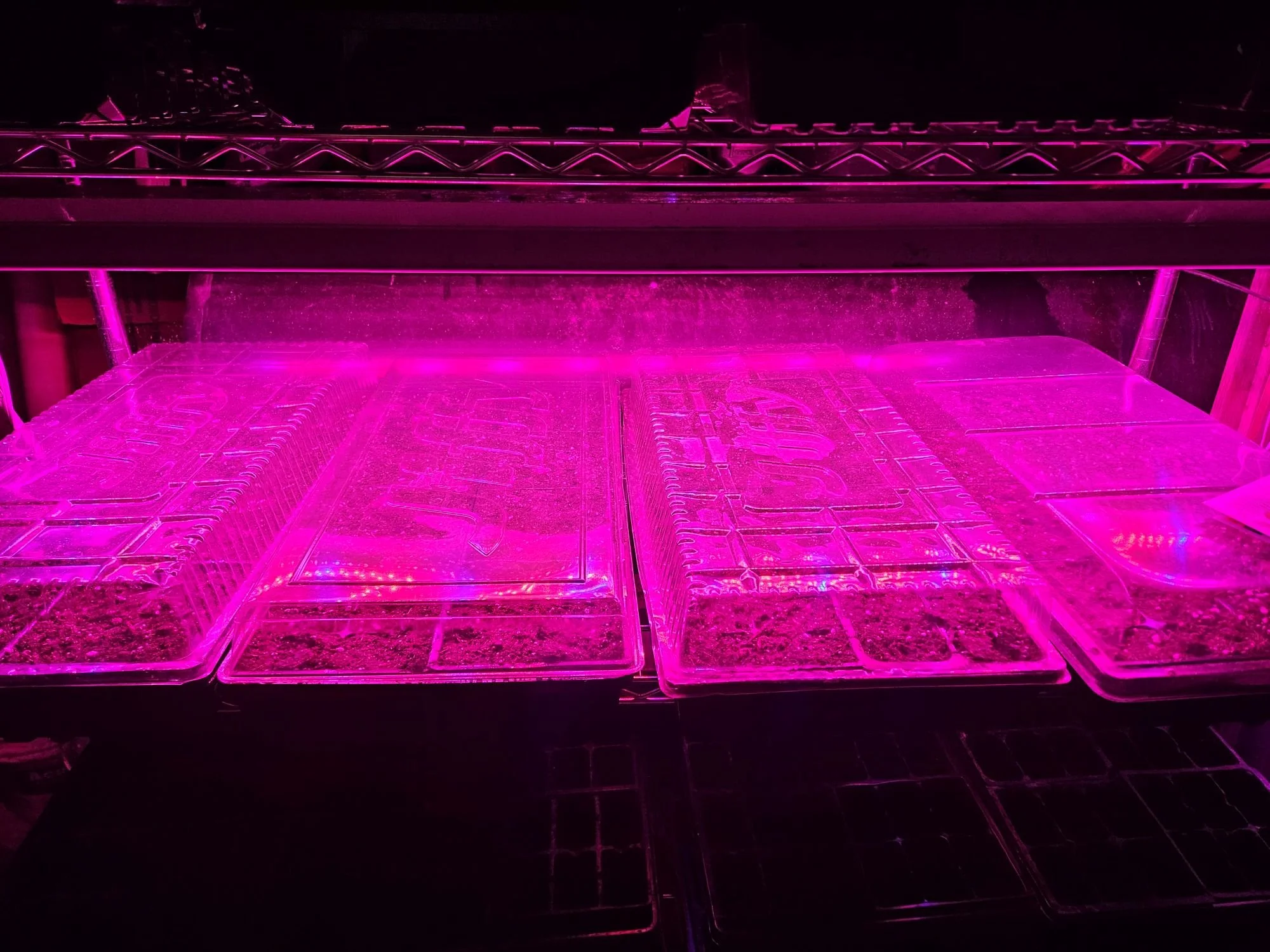 Each tray is labeled, monitored, and rotated under lights for 12–16 hours of light daily