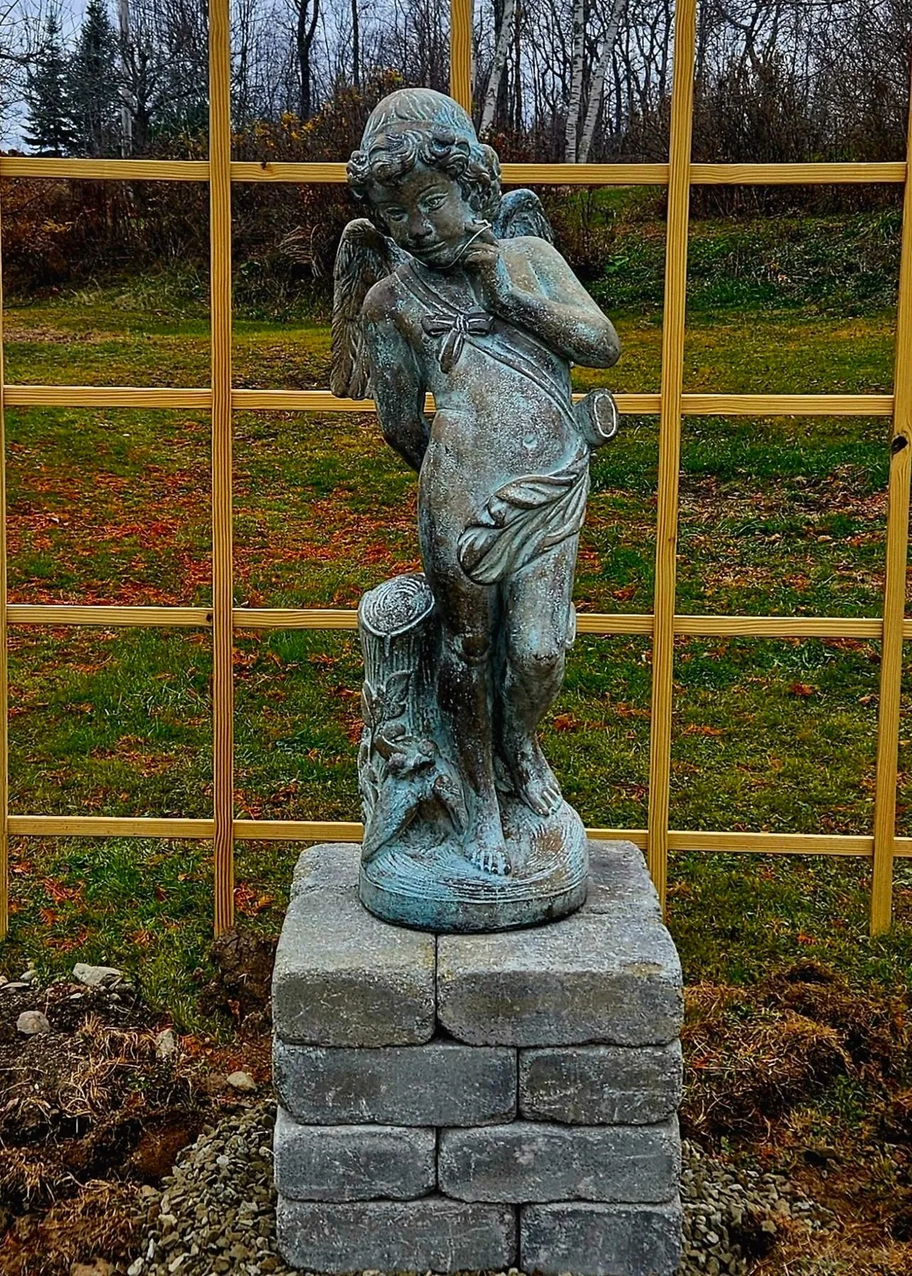 At the same time, another dream came to life — a 50-foot trellis and the creation of a David Austin Rose Garden. With over forty old-world roses planted, this space was designed to evoke timeless romance. At its center, a statue of Cupid stands as a quiet reminder of the love stories that continue to unfold here.